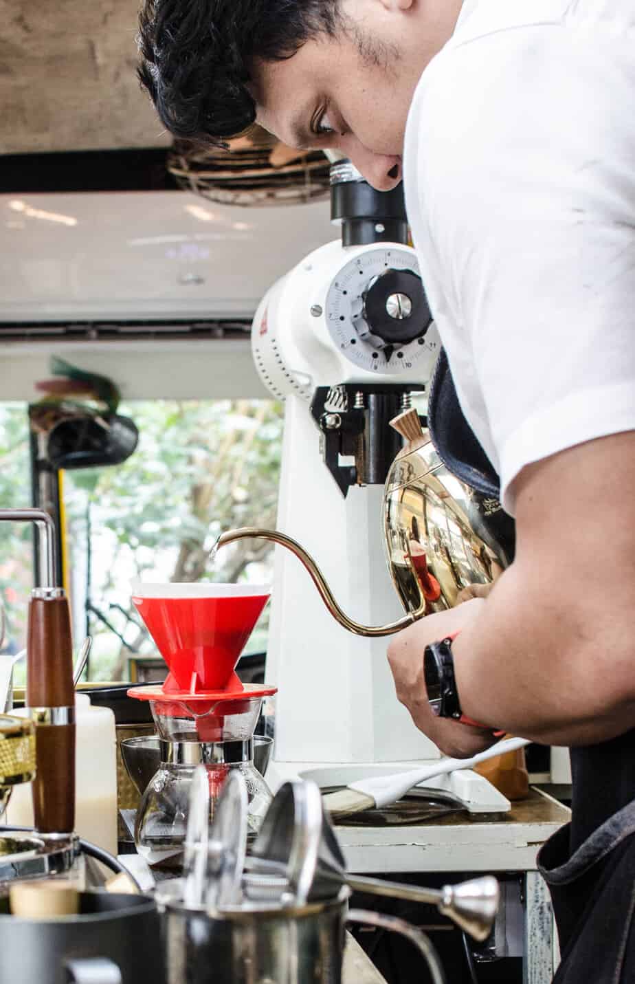 จากนั้นก็เข้าพิธีกรรมชงกาแฟดริป เริ่มต้นจากการล้างกระดาษกรองตามด้วยน้ำร้อนตามอุณหภูมิที่ต้องการ ปริมาณตามอัตราส่วนที่คิดค้นมาแล้วจากที่ร้าน ในระหว่างที่ชงเสมือนกับว่าเราได้อยู่ในรถที่กับพาทัวร์ไปในโรงคั่วกาแฟ หอมมากกกกกก